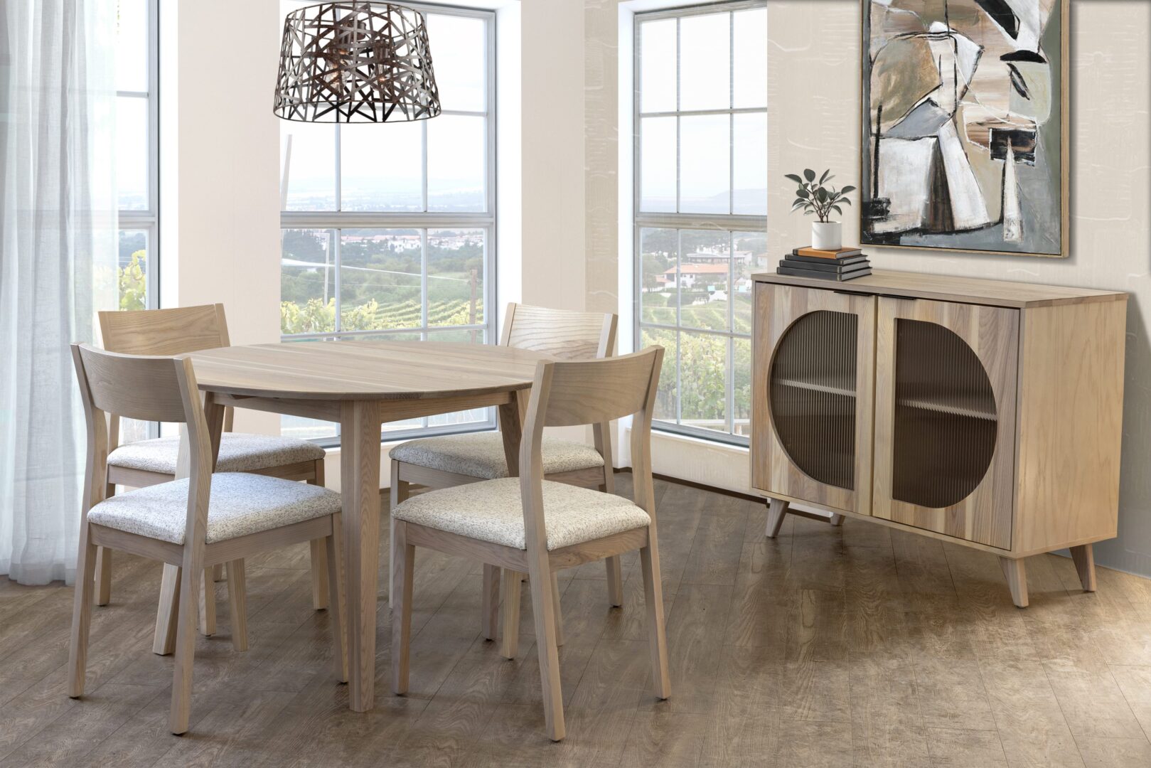 Chaise Table ronde 42 x 42 – patte en angle Buffet vitrée en demie lune – vitre flutée