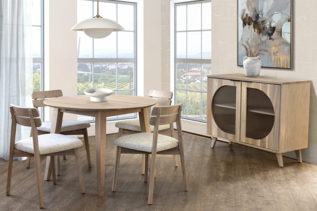 Chaise Table ronde 42 x 42 – patte en angle Buffet vitrée en demi-lune – vitre flutée